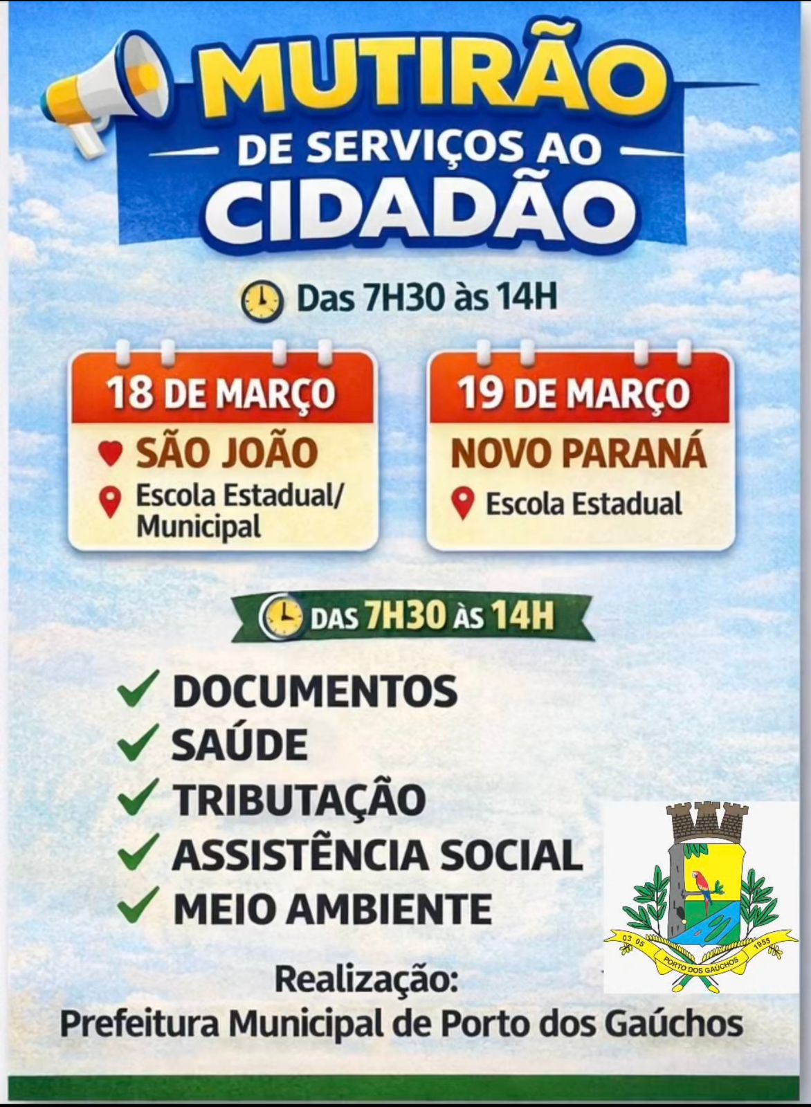 A Prefeitura de Porto dos Gaúchos convida toda a população das comunidades e regiões próximas para participar e aproveitar os serviços disponibilizados durante o mutirão.