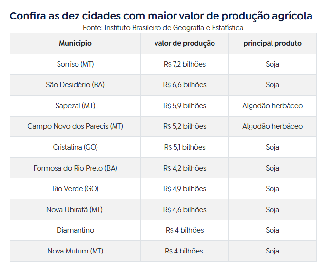 O Brasil é o maior produtor de soja do mundo, com 144,5 milhões de toneladas em 2024. Dos dez municípios que lideram o ranking de valor de produção agrícola, oito têm a soja como principal produto cultivado. As exceções são os mato-grossenses Sapezal e Campo Novo do Parecis, impulsionadas pelo algodão.