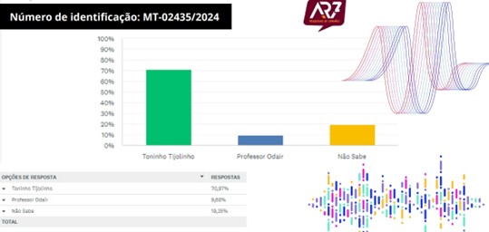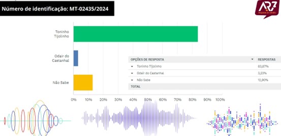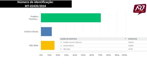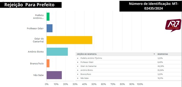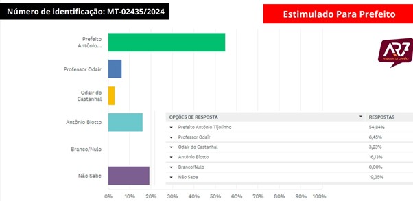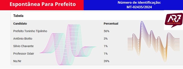 A pesquisa registrada no Tribunal Superior Eleitoral, sob o número MT-02435/2024, foi encomendada pela Central Transmitindo de Comunicação e conduzida entre os dias 19 e 23 de março, ouvindo 298 residentes locais, distribuídos em diversos setores do município, como os bairros Cidade Alta, Centro, Jardim Vitória, Sol Nascente, Recanto dos Pássaros, Bairro Sossego, Castanha e Comunidade Nova Jerusalém.