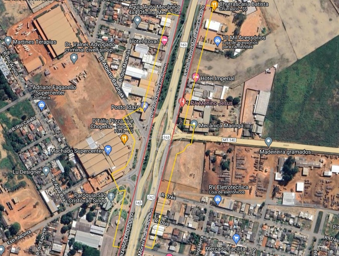 São 3 pontos que serão desapropriados, um para cada dispositivo diamante (uma espécie de trevo). O primeiro e maior fica no KM 931+300m da rodovia, no ponto em que a MT-140 se conecta com a BR-163. Nesse local a ANTT autorizou a desapropriação de uma área de 50.349,04 metros quadrados. Nesse espaço estão parte do estacionamento e praça da Igreja São Cristóvão, do supermercado Machado SuperCenter, os postos de combustível da Idasa e Simarelli, além de outras empresas tanto na margem direita como esquerda da rodovia.