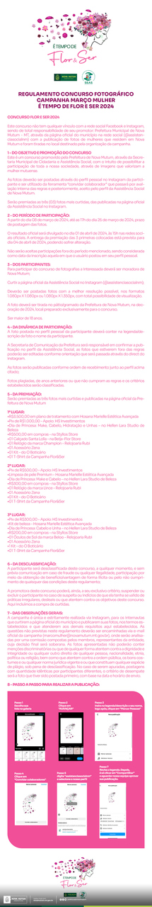 Para participar é muito fácil: basta tirar uma foto nas decorações em alusão ao mês da mulher, e as fotos deverão ser postadas através do perfil pessoal no Instagram da participante e ser utilizada a ferramenta “convidar colaborador”, que passará por avaliação interna das regras e posteriormente será aceita pelo perfil da Assistência Social de Nova Mutum.