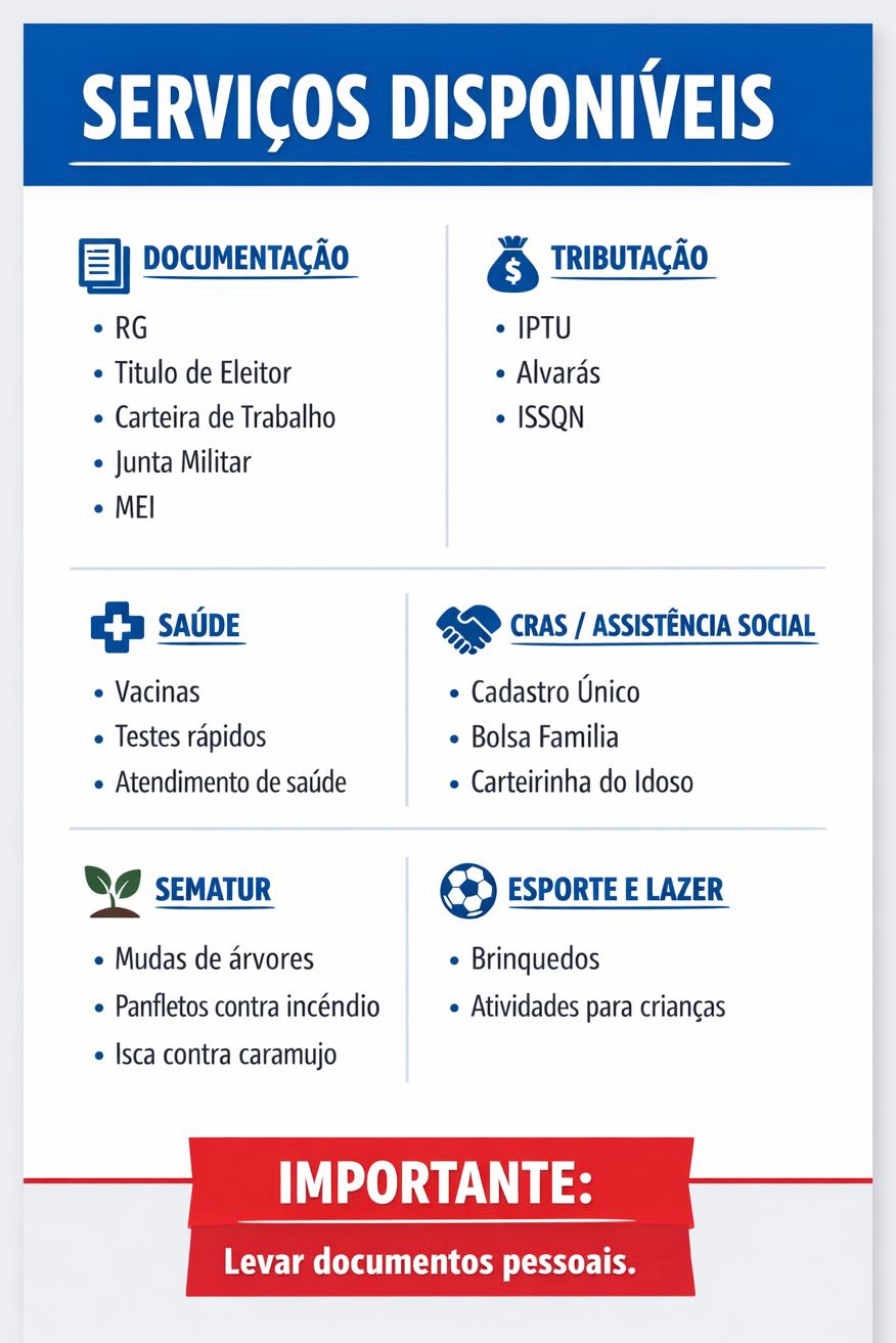 Durante o mutirão, diversos setores da administração municipal estarão reunidos em um único local, oferecendo serviços nas áreas de documentação, tributação, saúde, assistência social, meio ambiente e atividades de lazer para crianças.