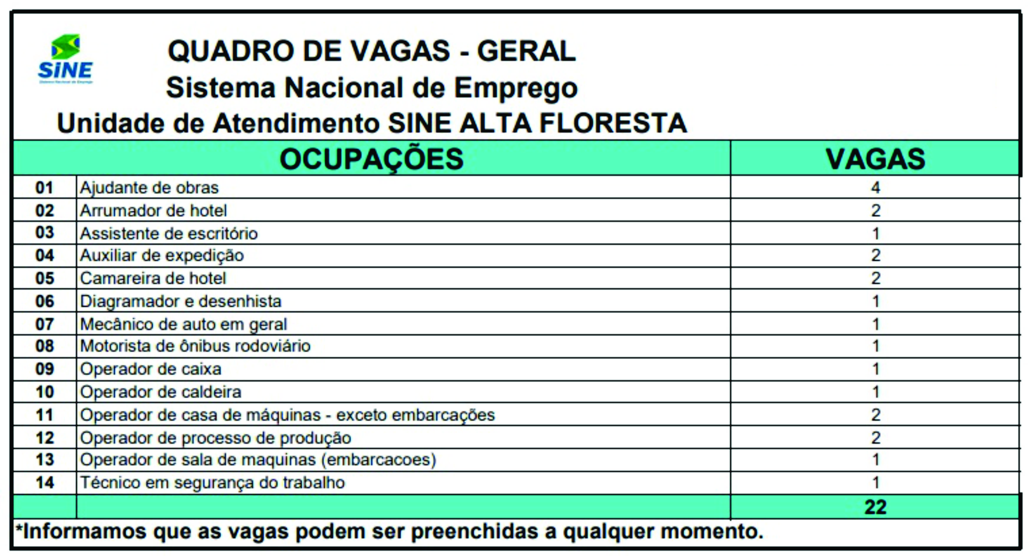 Para quem está buscando uma oportunidade no mercado de trabalho, o Sistema Nacional de Emprego (SINE), Unidade Alta Floresta, está disponibilizando vagas de trabalho. Ao todo são 22 vagas abertas.